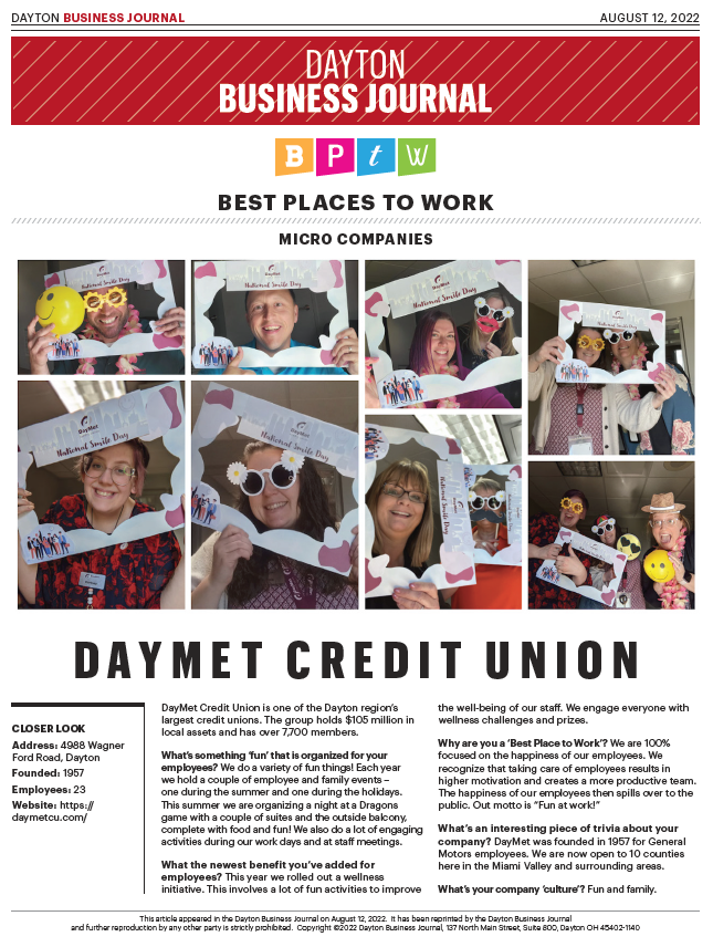 We were recently honored as a one of Dayton’s “Best Places to Work” by the Dayton Business Journal. We are so lucky here to have a fabulous team that supports each other. We make sure that we have fun while we serve our wonderful credit union members!